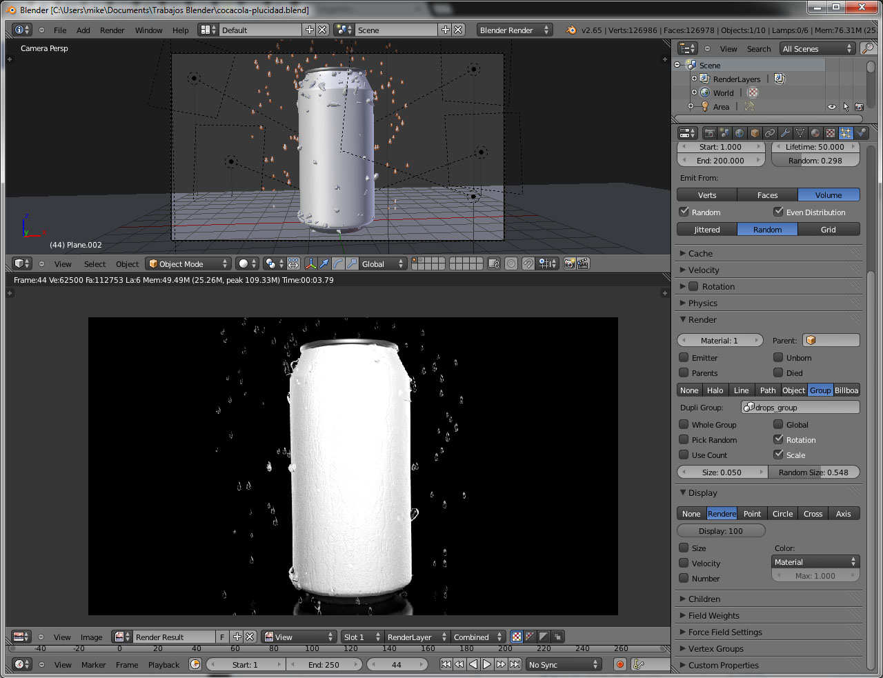 Hola compañeros del mundo, he estado practicando con Blender desde hace ya unos 6 meses y poco a poco voy adentrandome en los componentes más complejos, en esta ocasión estoy experimentando con Partículas y estoy tratando de realizar un efecto de gotas de agua chocando contra una lata de gaseosa, pero no logro encontrar la manera de que las gotas actúen respecto a la lata, o sea qué no traspasen el material.