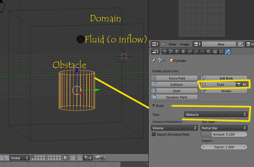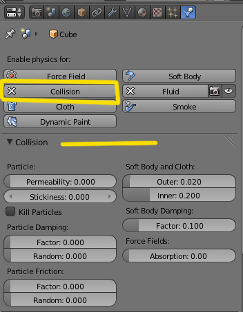 Si no es con físicas de fluido, sino que solo utilizas partículas chocando con el objeto, es en Physics - Collision (colisionan las partículas con el objeto).