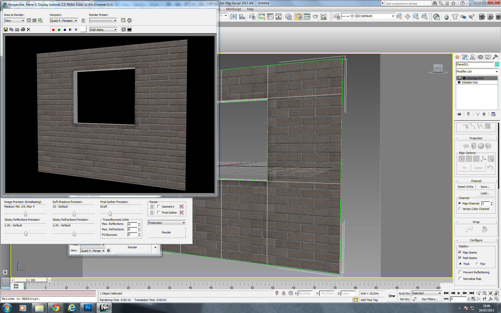 Uso el Adobe Photoshop para retocar los ladrillos y que queden bien al repetirse. Y estoy trabajando con el 3ds Max 2013.