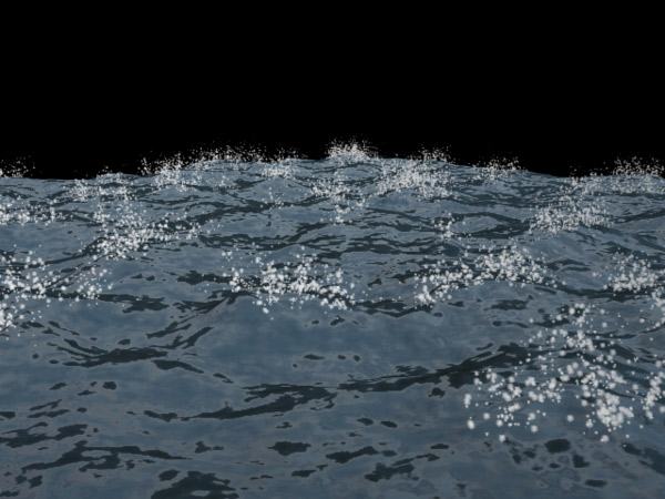 Para hacer la espuma le aplicas un modifiacdor select, volumey seleccionando las crestas de las olas(vértices) le aplicas un parray que emita en modo subobjeto seleccionado.Cita: