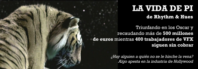 Llevo algunas horas digeriendo esta noticia repartida en los muros de FacebOk y demás redes sociales, de mis colegas de profesión. He ido leyendo noticias de varios medios, no muchos en español, y me han dado ganas de expresarme. Por lo tanto, lo que voy a escribir aquí es mi opinión personal, totalmente rebatible. Pero el desahogo que no me lo quite nadie. Y es sobre la película La vida de Pi, de Rhythm & Hues, que ha obtenido un gran éxito en taquílla, pero que ha entrado en bancarrota y tiene a sus artistas de VFX sin cobrar un euro.
