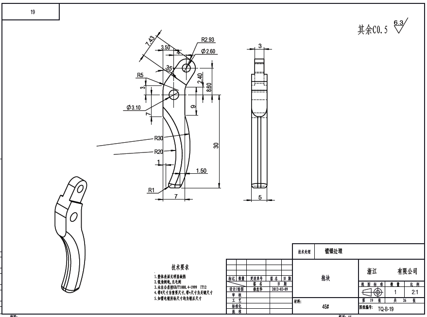 Las medidas las tienes en la imagen de la pieza acotada qué has subido. Una vez dibujada, tendrías que obtener el perfil de una de las dos zonas seccionadas que hay, son casi simétricas si no fuera porque una tiene un taladro. En principio he ignorado ese taladro para hacer el perfil, lo hago posteriormente y se lo resto al primer volumen obtenido.