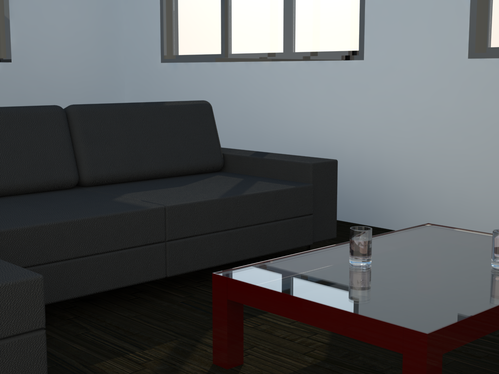 Lo de incluir imágenes HDRI te puede ayudar en el tema reflejos, puedes optar por colocarlos en cada material (para lograr efectos diferentes) o desde las configuraciones globables de Vray, depende también que HDRI vayas a usar, respecto a los muebles o los materiales de los mismos, se ven muy perfectos habría que modificar algunos ítems del modelado para darle un poco más de soltura a las formas, por ejemplo, almohadones más suaves u orgánicos, (no tan prismaticos) algún que otro énfasis en los radios de las aristas de los cuerpos rígidos y luego experimentar con los materiales translucidos como el de la mesa o el vaso. Este tipo de materiales son complejos para renderizar y su configuración varía bastante con el tipo de escena qué vayas a realizar, con los valores de IOR y FOG puedes jugar bastante para cambiar los resultados.
