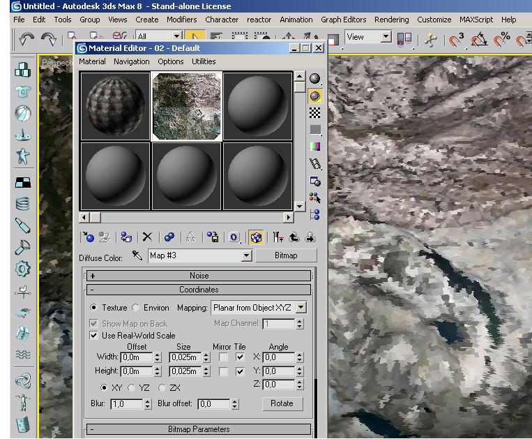 Hola. Soy nuevo en esto y estoy trabajando con 3ds Max 8, he logrado generar el terreno desde las curvas de nivel (Create>>compound objet>>terrain), pero no he podido adicionar la imagen correspondiente a este sector, he intentado de la siguiente forma: