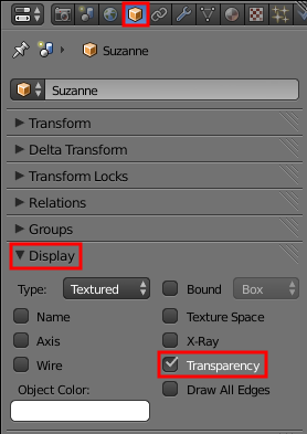 Después, para qué la transparencia se vea en la vista 3D, tienes que indicarlo en el objeto. En el menú Object, apartado Display y activas Transparency":