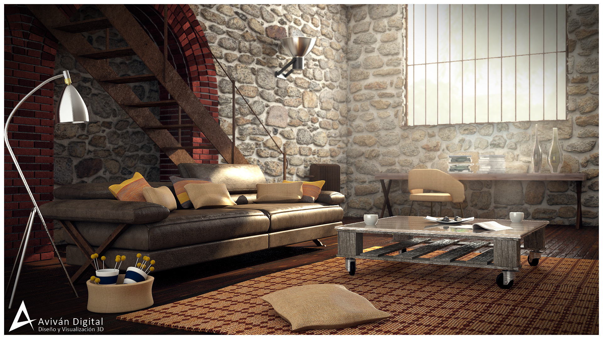 Inspirado en una imagen de un salón de Roche Bobois, le he querido dar un encanto rural.
