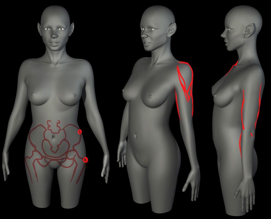 Buena observación, YeraY. No suelo hacer esto, pero el modelo esta tan bien que no he podido remediarlo. Cuidado con los músculos del brazo, si no es excesivamente gorda se tienen que apreciar más definidos y cuida que no haya nada demasiado liso, que da aspecto de firmeza o tirantez, y no es habitual verlo en personas normales. Los huesos de la pelvis también hace que la piel tire de dos puntos que te he marcado en rojo, si el modelo fuese un poco más angulado en esas zonas quedaría mejor.
