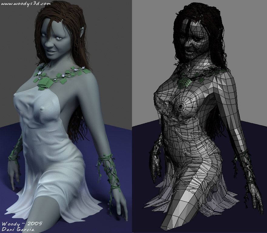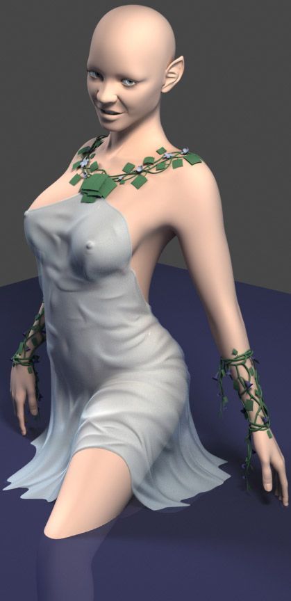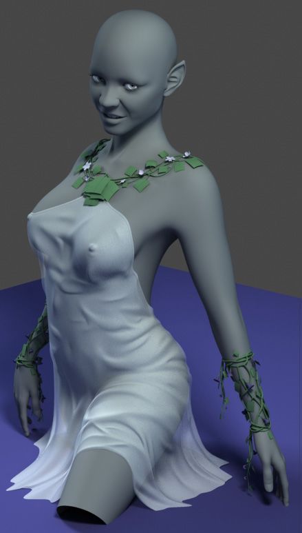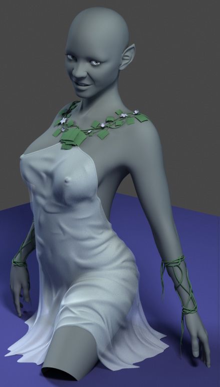 Pues aquí llega otra, unos pocos cambios en el pelo y el collar de hojas. Tema gotas ya tiene, pasa que en pequeño cuestan de ver (y además en los últimos renders estaban escondidas, con lo que se hace aún más difícil de ver. ) y lo del pelo ya se ha que te refieres, lo tendré que mirar por que en grande se ve bien, pero en pequeño parece todo continuo.
