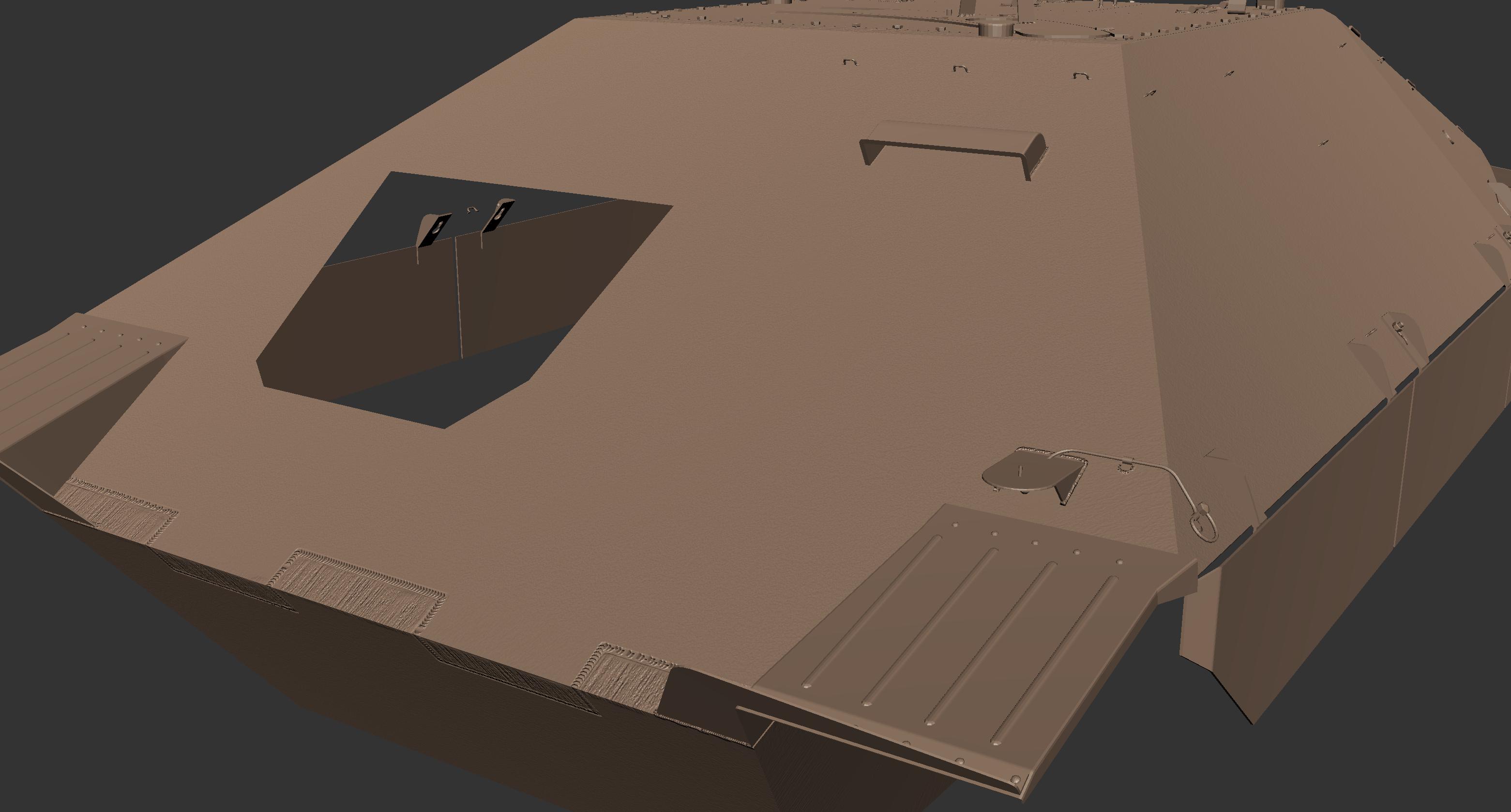 Si trabajaré en lo del barro, sobre abrir, va a ser que no, porque, aunque las escotillas son todas independientes, no están modeladas por el interior. Respecto a colocarle cosas estoy en ello. Ayer hice una prueba colocando el cable de acero de remolque y probé poner un cubo, aunque este último no que convencía como quedaba y lo he eliminado.