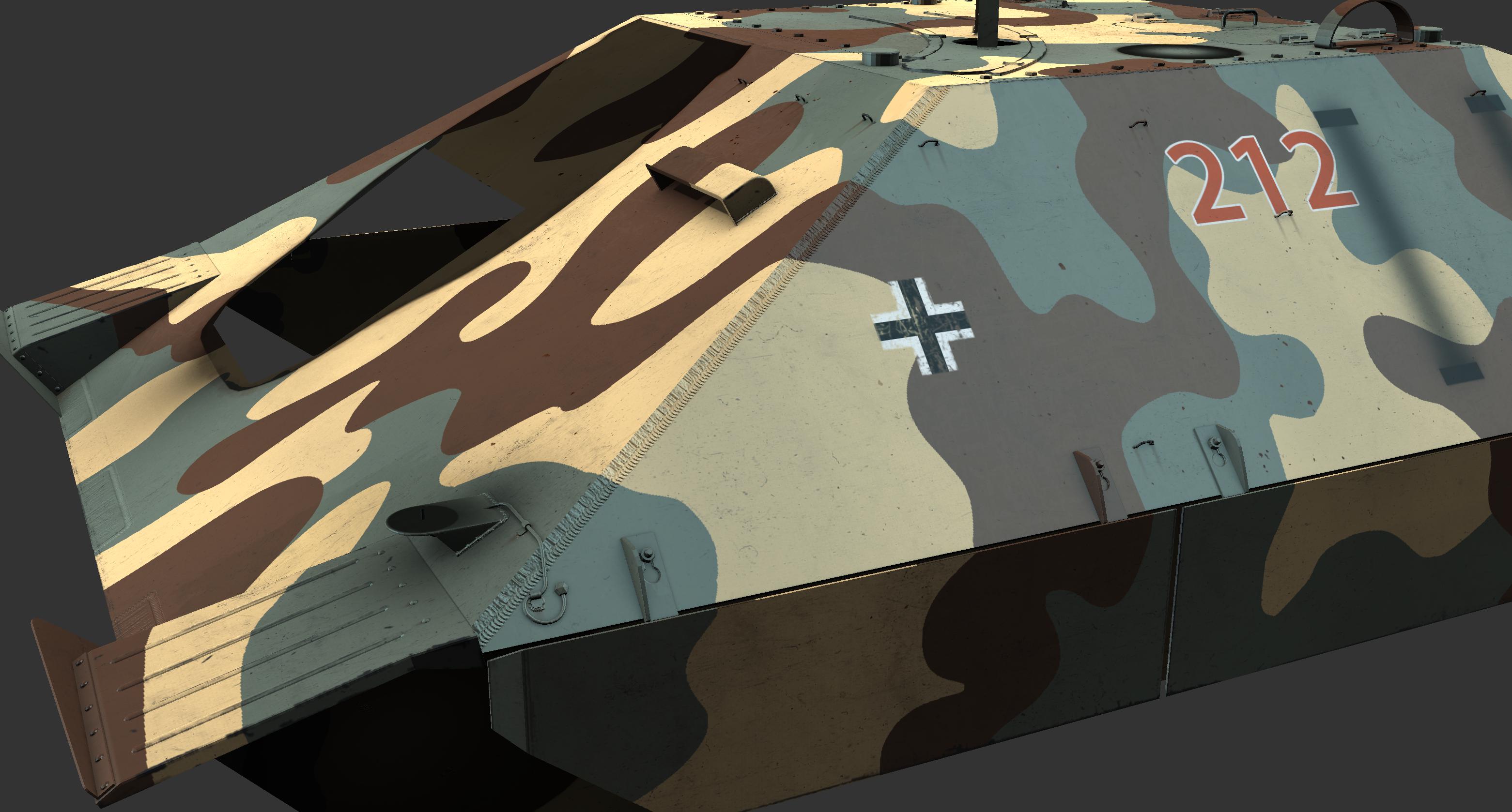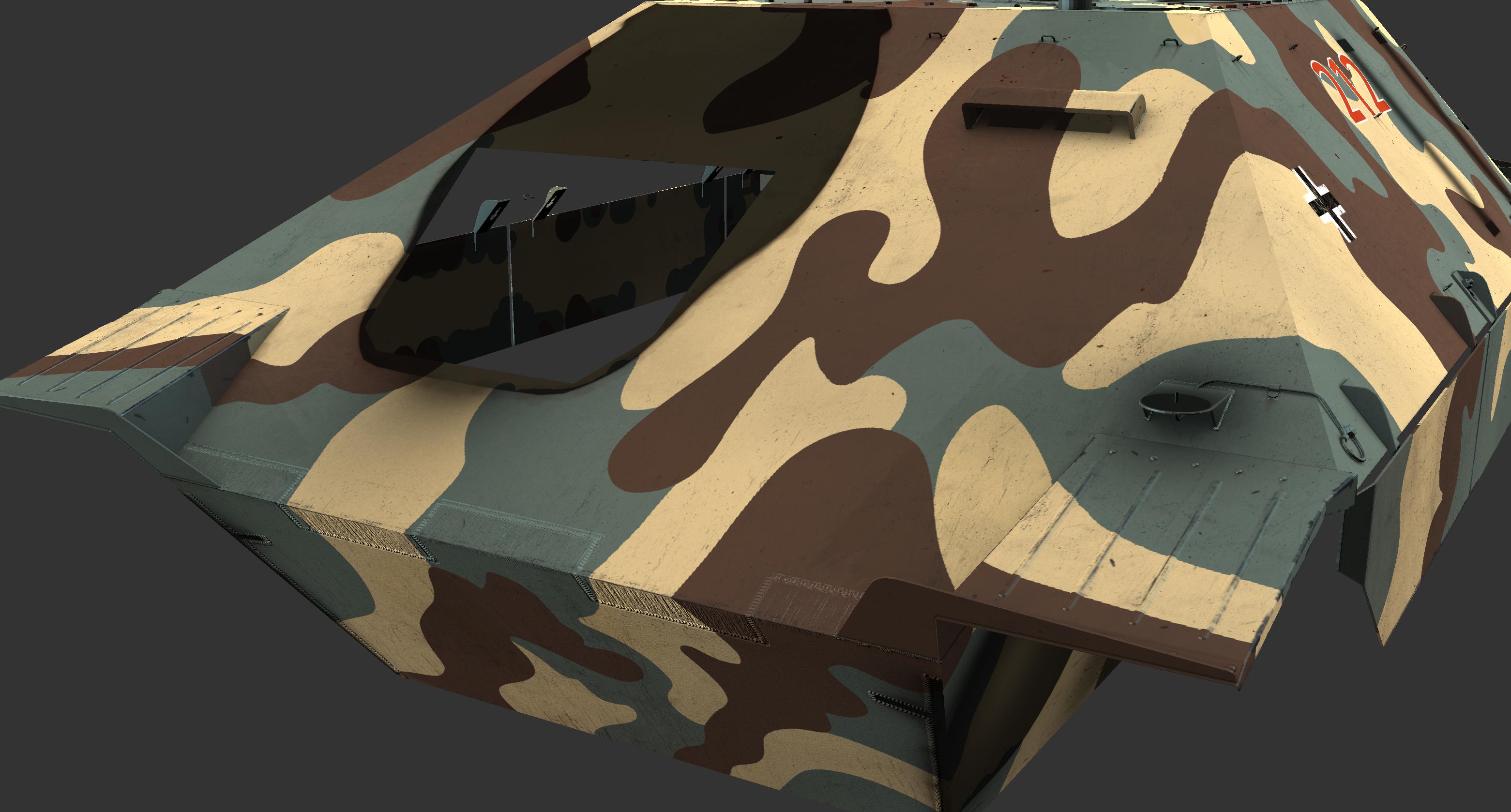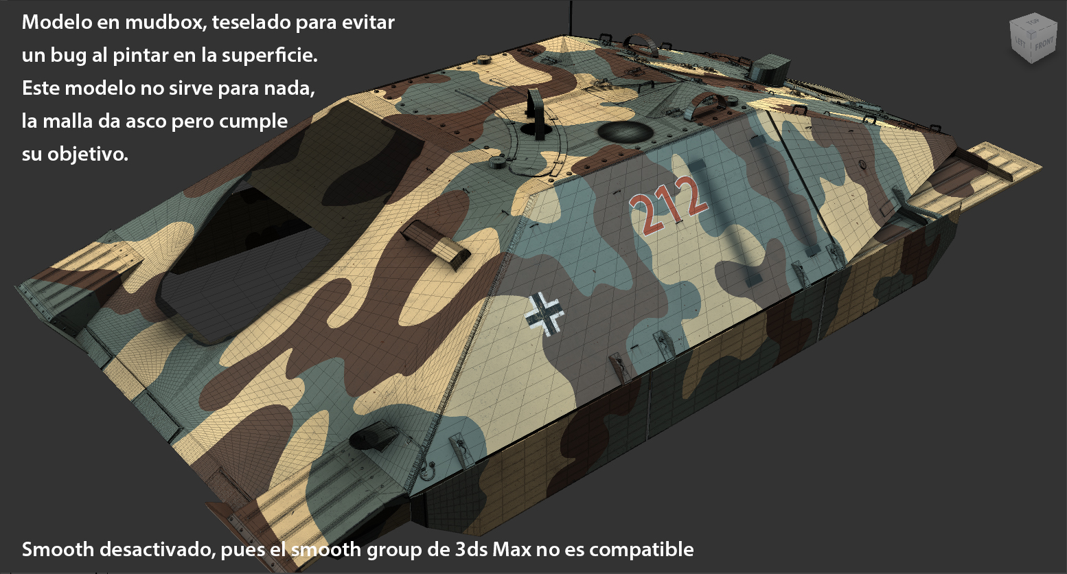 Bonito material, lo único raro el bump del frontal bajo, que tiene bump y no se le notan manchas de barro, pero me gusta el grado de realismo que tiene Prueba a tirar un render con alguna escotilla un poco abierta, es que se hace algo raro verlo tannnn cerrado todo. Y algún madero por ahí encima, como los rusos, los usaban y usan para desatasCarlos del barro.