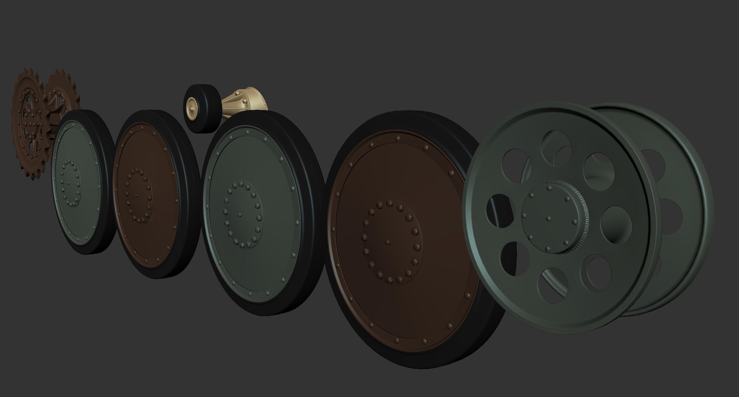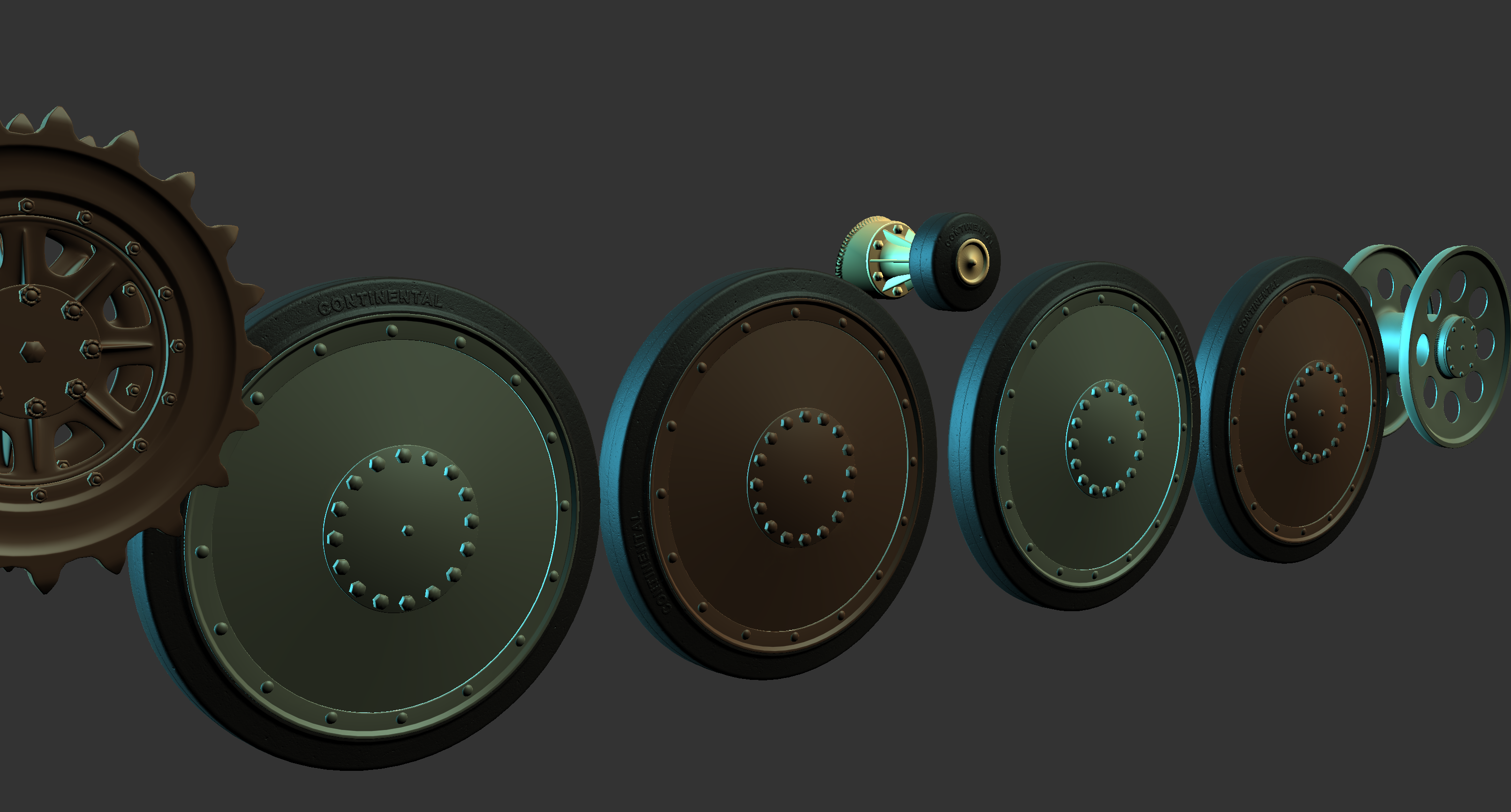Ya tengo las ruedas, rodillo, motriz y tensora mapeadas y con los colores básicos. Ahora toca un poco de Photoshop.
