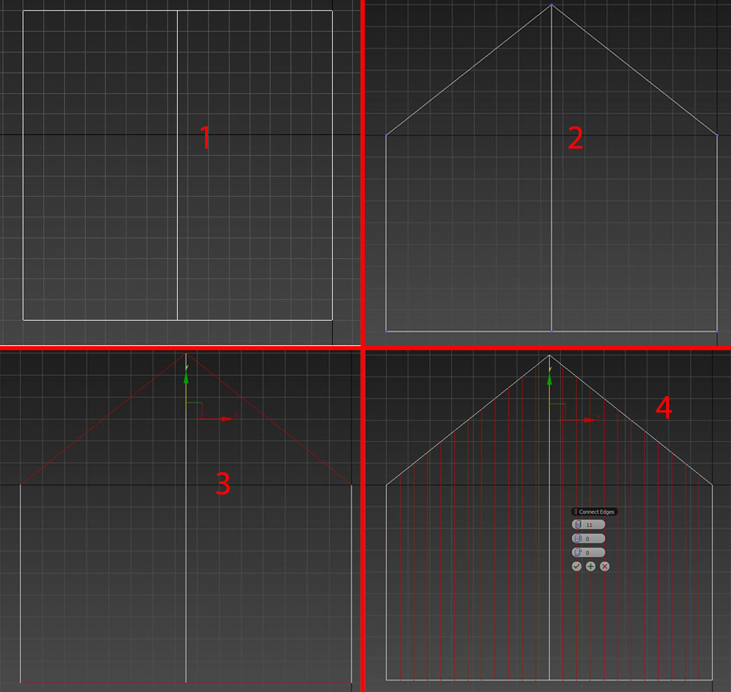 Listo, logré hacer lo que necesitaba, al final cambié de plan y en vez de enfrascarme en mover los benditos vértices, comencé con un plano, lo modelé dándole la forma de un triángulo. Seleccione los dos bordes superiores y el inferior para finalmente insertar las divisiones (usando la opción connect).