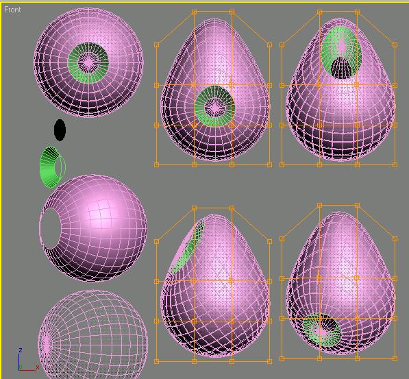 Tengo un ojo elíptico que se deforma horriblemente porque la pupila y el iris están modelados hacia dentro, es decir, si la pupila fuera una textura esto funcionaria porque la esfera externa funciona, pero al ser un ojo con iris y pupila modelados estas se deforman horriblemente.