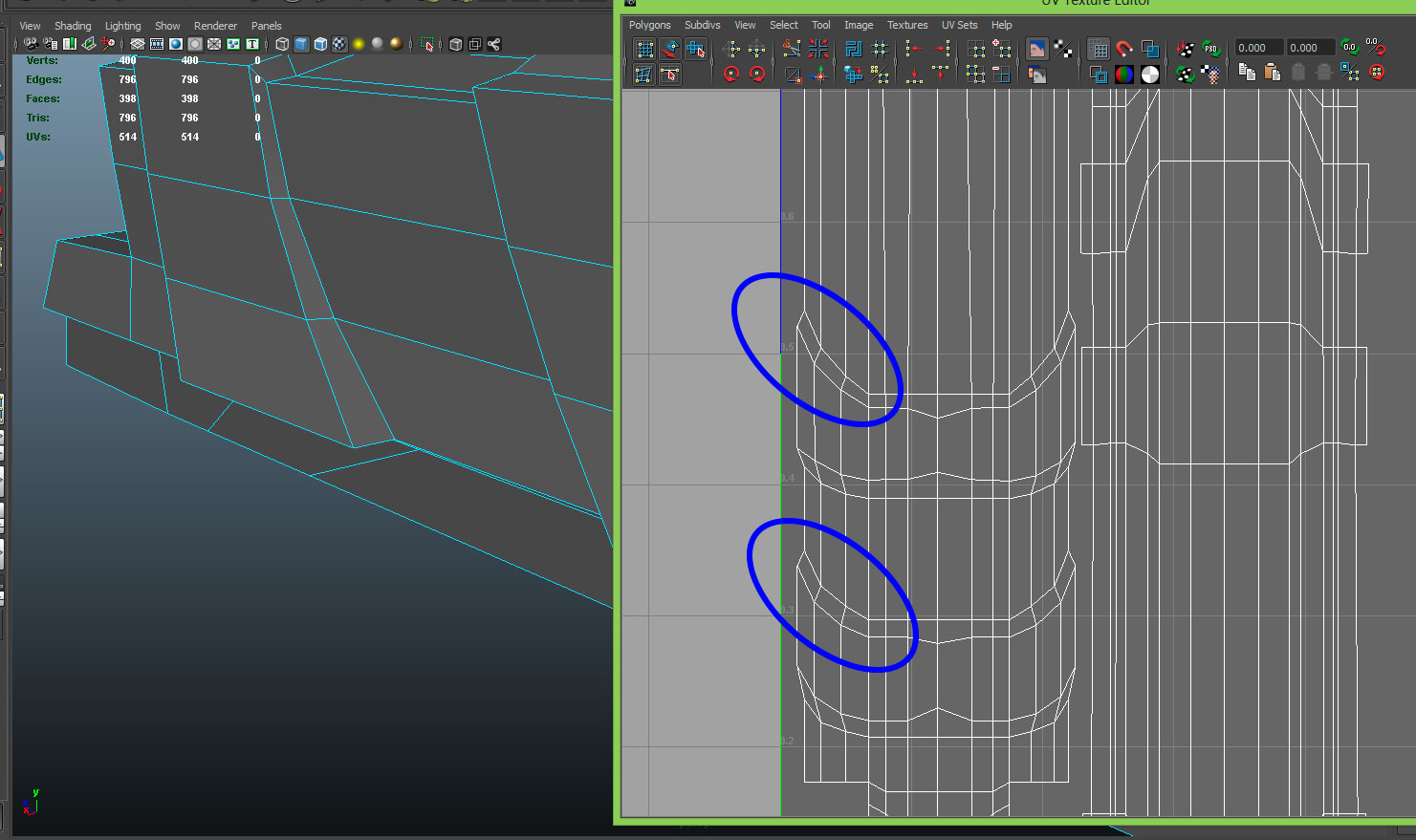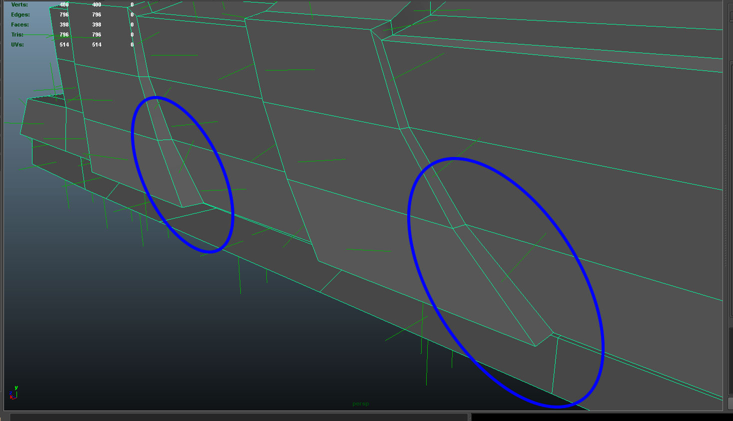 Lo que me parece curioso es que solamente pasa en esos dos polígonos y en los dos lados del modelo. Está claro que hay algo de lo que he hecho que no le gusta a Maya.