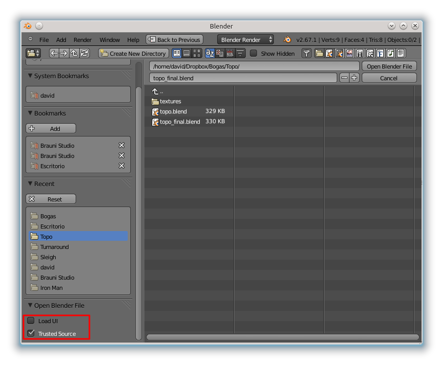 También cuando tengas algún problema de interfaz en un archivo en concreto, puedes cargar el blend sin que cargue la interfaz y usar la que tienes en ese momento, desactivando la opción Load UI de la ventana Open: