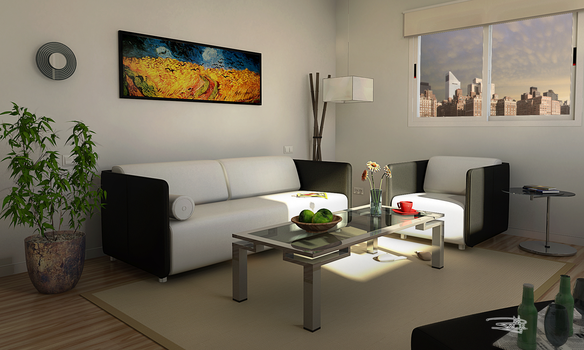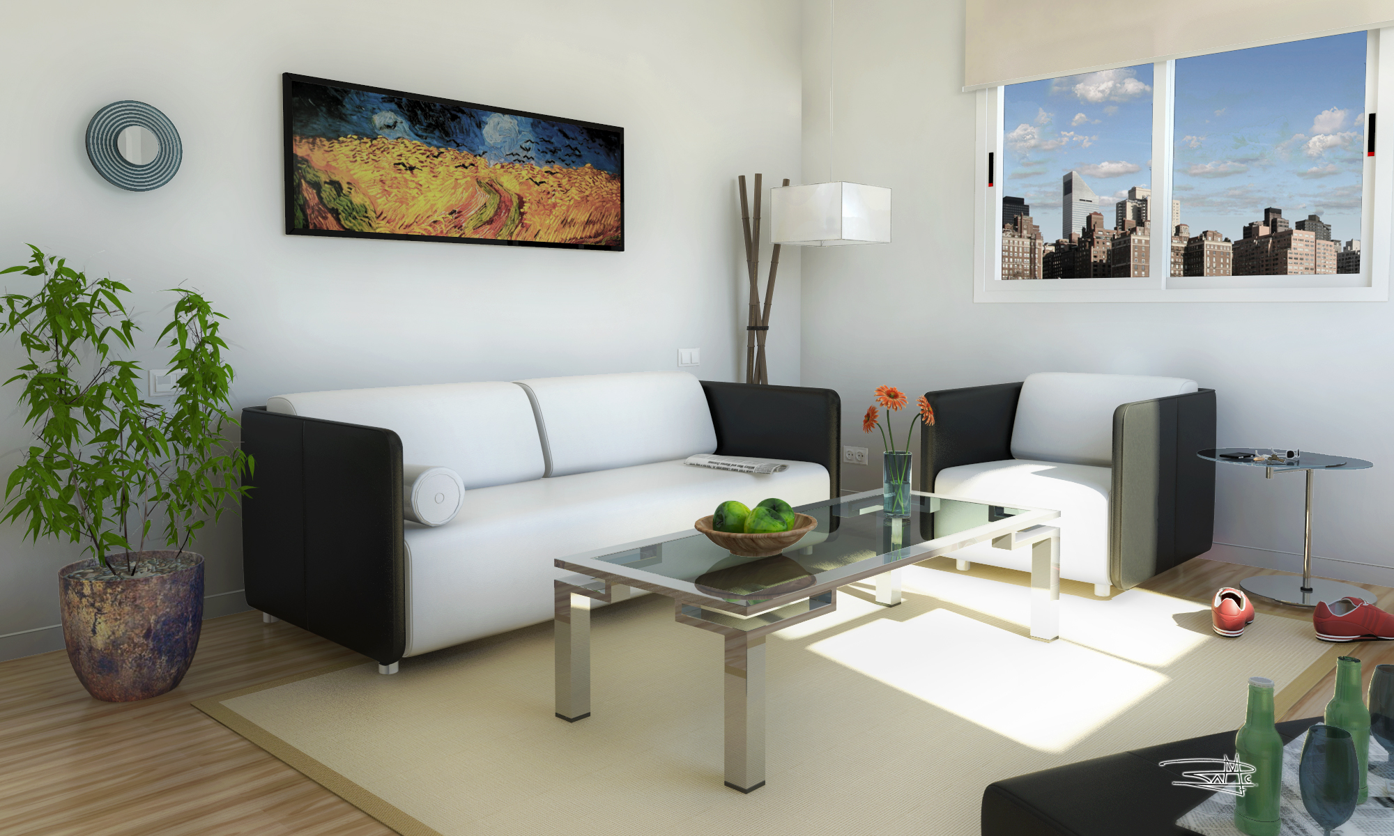 La primer imagen está muy buena, pero la ventana parece otro cuadro quizás buscaría jugar un poco con la imagen que le pusiste de fodo quizás con los niveles, además tomando en cuenta la iluminación de la imagen te tendría que estar entrando luz por esa ventana lo cual estaría muy buena ya qué le daría más realismo. Otro problema ses la maceta de la izquierda está muy plana parece puesta en Adobe Photoshop, que quizás fue lo que hjiciste, en ese caso te aconsejo poner una en el programa qué modelas, y si no es así debes tener cuidado con las sombras, el resto está genial.