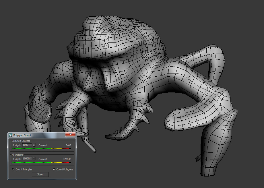 Tienes toda la razón, ayer ya era tarde y solo subí el render, tenía preparado un poco el proceso. Ahí va. La primera es la malla en alta del sculptris, no recuerdo cuantos polígonos eran, creo que unos 500.000, la segunda es la malla en baja, hice la retopología con las nuevas herramientas para ello del max2011, hay más triángulos de los que debiera quizás, y la última es la malla en baja con el bakeado del detalle de alta.