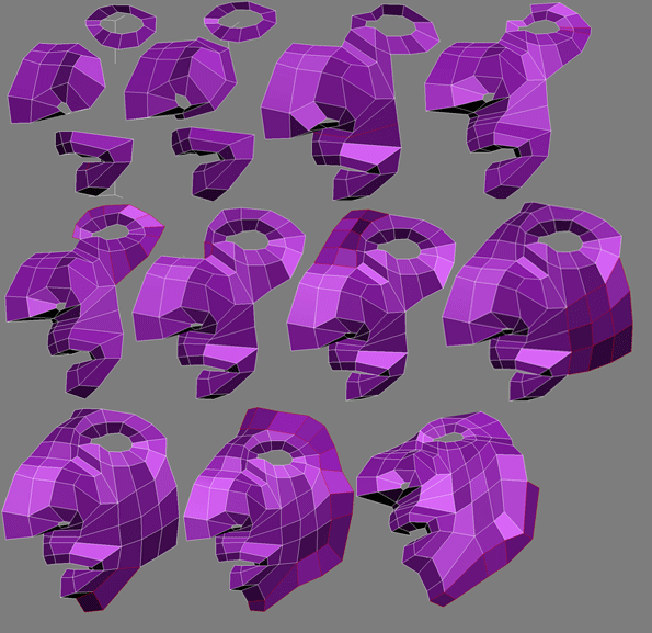 Se puede sacar la idea de cómo construir las orejas, cuello y ojos. http://www.foro3d.com/f112/modelado-...hop-61794.html. Saludos.