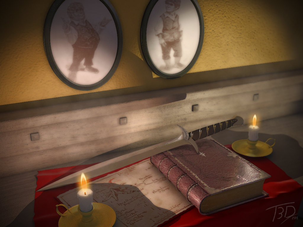 Si vas a modificar yo haría qué se reflejara la escena en el metal de la espada, el libro lo veo impresionante. Saludos.