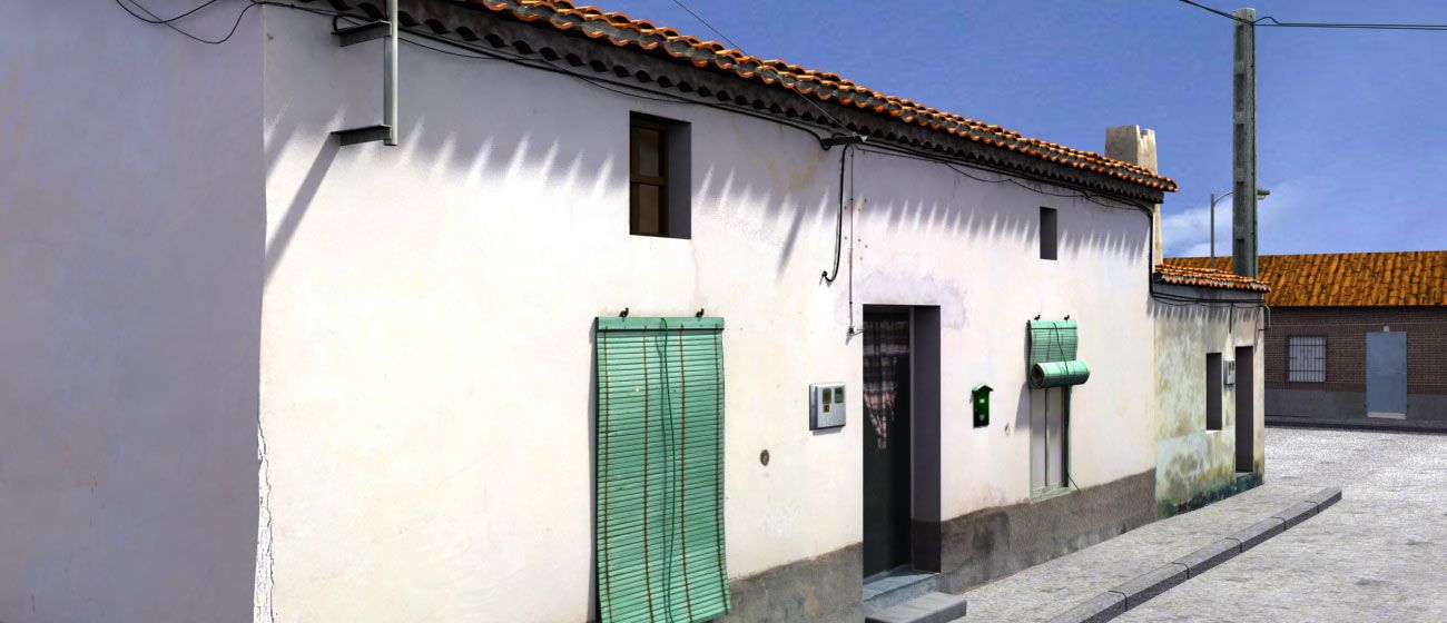 Las esquinas de las puertas y ventanas son demasiado rectas, deberían de ser algo más redondas y quizás deformadas. La casa del fondo tiene el tejado sin acabar, acaba recto y sin las tejas puestas en horizontal a lo largo del tejado cómo se hace para cerrar la cubierta. Las texturas de la carretera se repiten y se nota mucho, y la acera ganaría si le pusieras una textura de un empedrado.