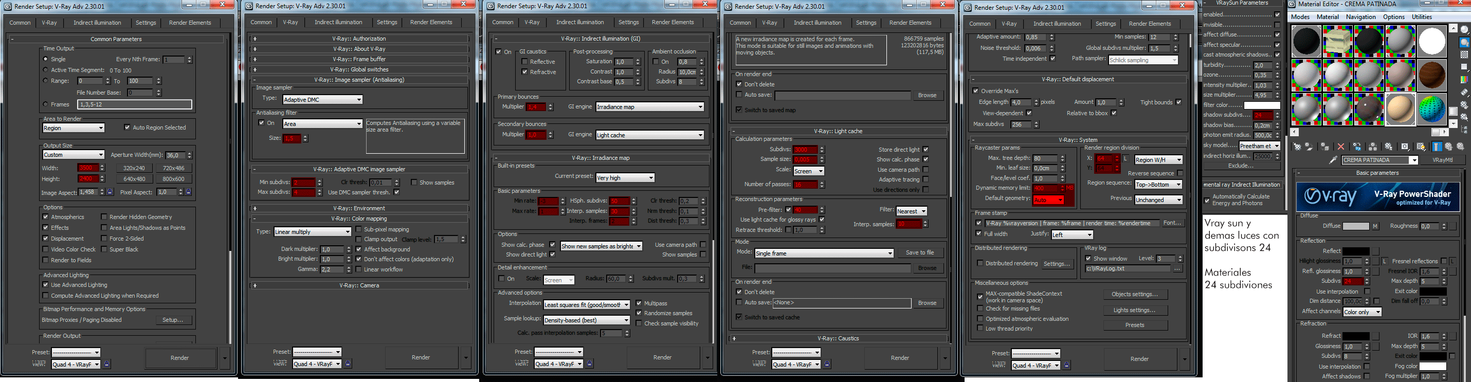 Bueno llegado a este punto me he decidido por aconsejarte que te mires estos dos enlaces de este mismo foro, creo que es la forma con la qué vas aprender más de parámetros. http://www.foro3d.com/f20/iluminació...vray-5474.html.