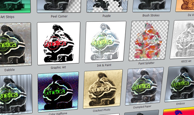 Filters, es capaz de aplicar una amplia variedad de efectos a las imágenes existentes o texturas creadas dentro de Genetica, puede seleccionar uno de los filtros predeterminados del programa o crear su propio filtro mediante la interfaz basada en nodos de Genetica.