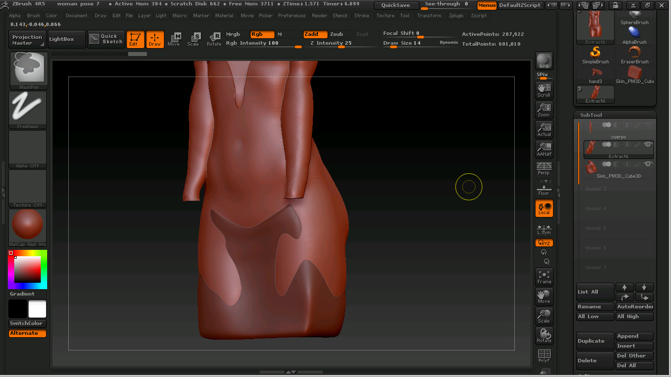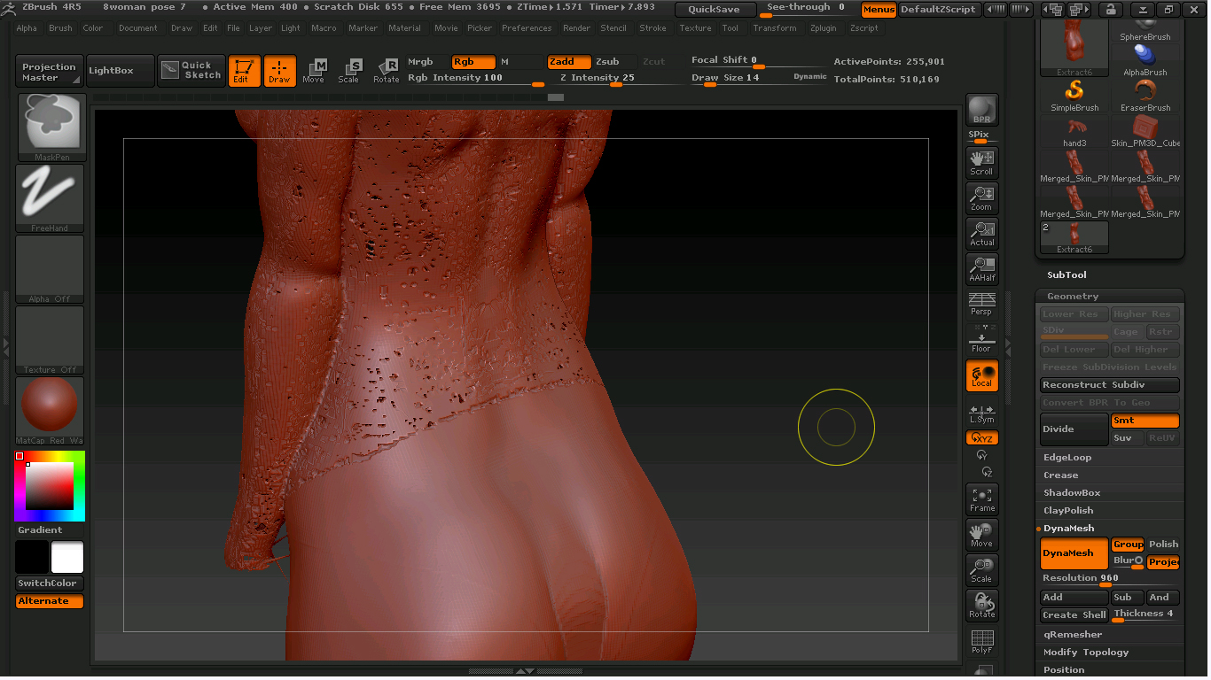 En la segunda fotografía he fundido las dos subtools, el traje y el cubo y si aplico un DynaMesh con esos parámetros y la Maya dividida en los 2 polygroups que se intuyen separados a la altura de la cintura aparece el poligroup de arriba lleno de agujeros, cual gruyere y el de abajo aparece correcto, si lo hago en un solo polgroup pasa los msimo de los agujeros, estoy un poco atascado.