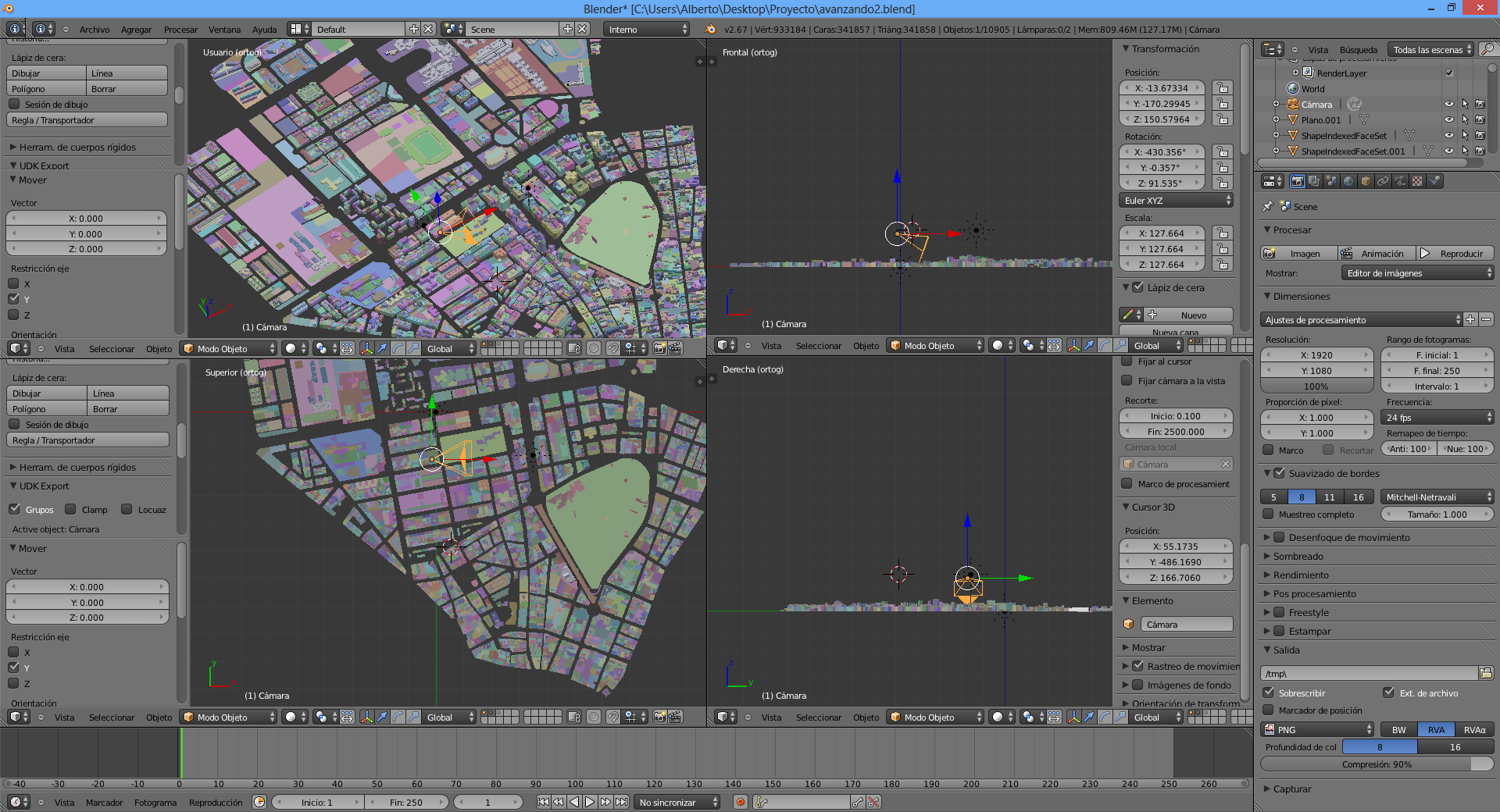Os cuento un poco el problema, tengo una escena de Blender de la ciudad de Albacete que posteriormente será el escenario donde se realizara un juego de conducción. El modelo obtenido mediante un trabajo previo con aplicaciones gIS como ArcMap y ArcScene. Mi problema principal es que no consigo trabajar correctamente con la escena ya que no hay forma de que se vea completamente, os pongo un par de fotografías que son bastente descriptivas: