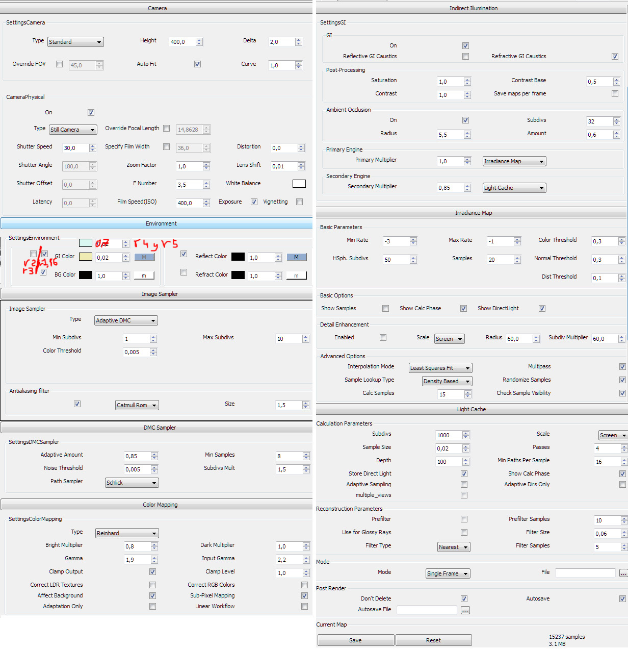 -Indirect ilu: reflective y refractive GI caustics of, Ambient Occlusion on, Iradiance map (min-3 max 0 hsp 40 samples 20) Light cache(1500)