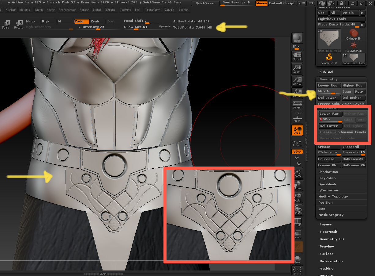 Hola amigos, es breve, lo que quiero saber es: ¿cuántas subdivisiones creen ustedes que tengo que agregar a las subtools para detalles como grabados y demás? Hice la prueba y hay subtools a las que he llegado a agregarle 8 subdivisiones, ya que, con menos no se veían muy bien, pongo imágenes para explicar mejor.Archivo adjunto 183057
