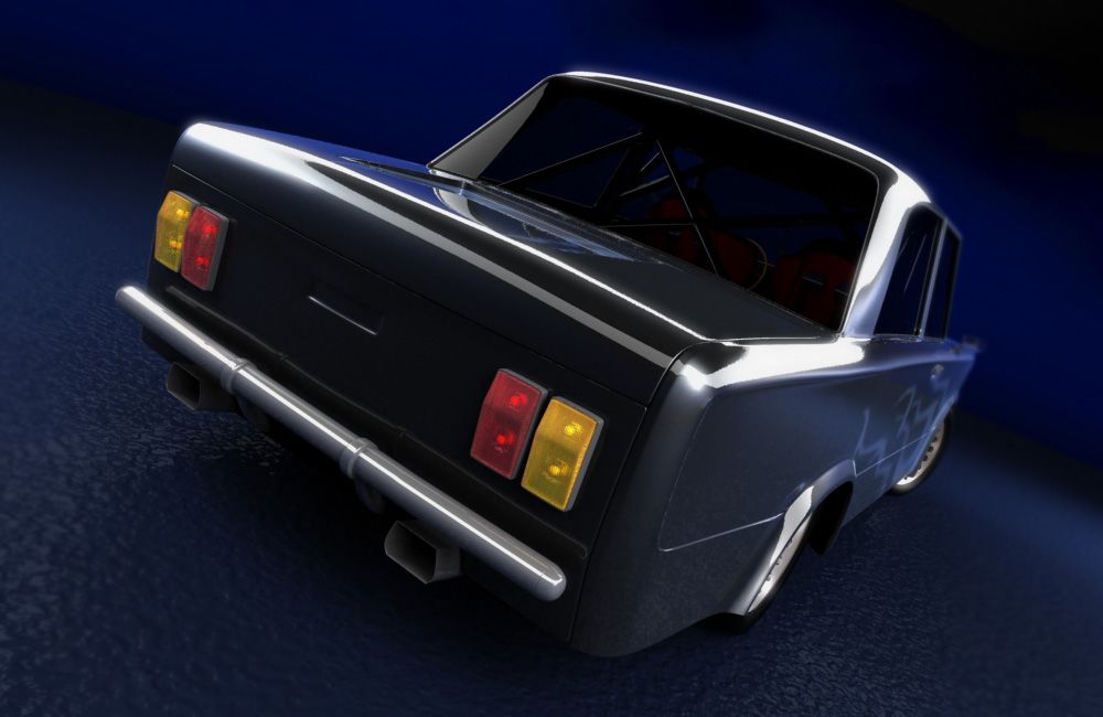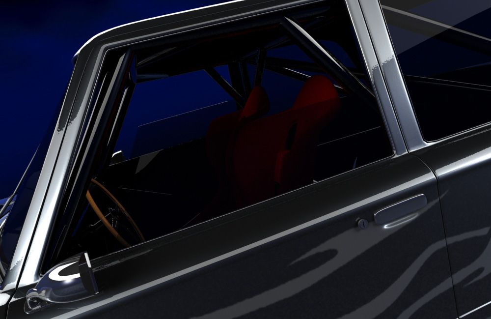 Y aquí una mirada por el interior. En esta imagen se nota que el bitmap utilizado para el trabajo de pintura en los costados del auto no es lo suficientemente grande cómo para renders de este tamaño. Tendré que solucionar eso.