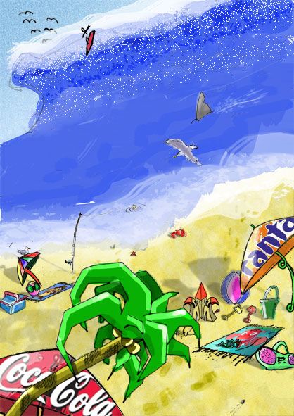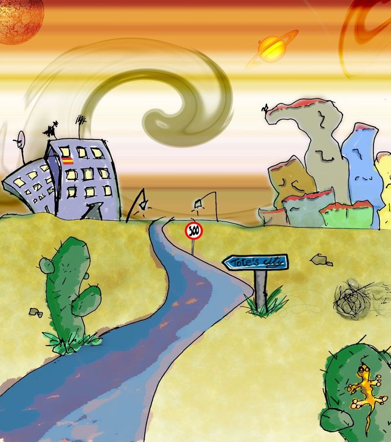 Hola, simpáticas imágenes, lo más importante a mejorar es la perspectiva, necesitan profundidad, antes de comenzar a dibujar divide mentalmente la escena en 1º, 2º y 3º plano, debes darle la información correcta al observador de que está viendo un espacio tridimensional, es decir, hay información contradictoria o que no alcanza a describir el efecto, si bien sabemos que, por ejemplo, uno de los cactos está cerca y otro está lejos (por lógica) lo correcto es acompañar esa idea con los demás aspectos, como son el color (la saturación disminuye y el valor aumenta con la distancia), la proporción cambia con la distancia (todos los objetos que has dibujado en primer plano son muy pequeños en comparación con los que están en segundo plano), la definición también disminuye con la distancia (en el caso de los dibujos entintados el tamaño de la línea de contorno es la que suele indicar el plano en el que está situado el objeto). Un saludo.