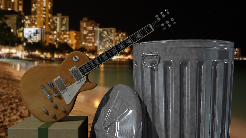 Estoy metiendo alguna superficie que otra, y no sé qué tal me va quedando el cubo de basura. No le he puesto ninguna textura de imagen al material. No estaría de más alguna opinión de cómo quedaría mejor. Es un tema complejo esto de la iluminación y las superficies. Además, le he cambiado el escenario por una playita, así quedará mejor cuando le ponga el dichoso fuego a la guitarra. Saludos.
