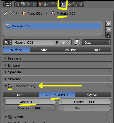 Si el plano que quieres hacer transparente, no viene ya con alpha (transparencia) en alguna zona, se puede hacer de la siguiente manera.