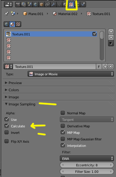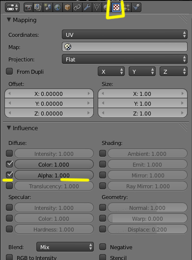 En TEXTURE > INFLUENCE > Alpha a 1.000