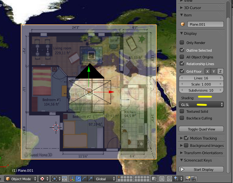 Hola amigos, en Blender 2.68 tengo en una vista (superior) una fotografía como fondo de un edificio visto desde el satélite (de Google maps).