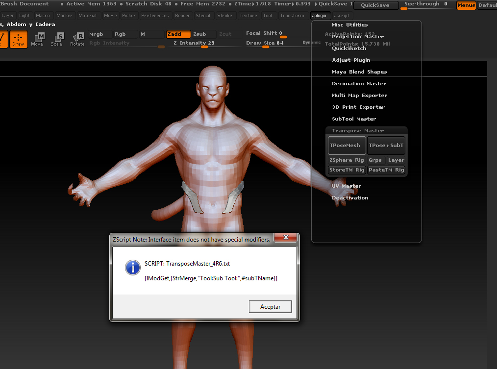 La cuestión es que cuando aprieto el botón de TPoseMesh se queda en esa subtool y me salta ese error. Qué podrá será Gracias.