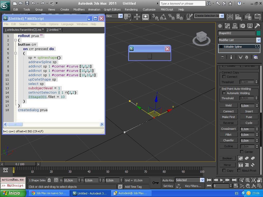 Button cr ton cr pressed do t(t	sp = splineshape() t	addnewSpline sp t	addknot sp 1 #corner #curve [0,0,0] t	addknot sp 1 #corner #curve [10,0,0] t	addknot sp 1 #corner #curve [10,10,0] t	upDateShape sp t	select sp t	subobjectlevel = 1 t	setknotSelection $ 1 #(2,2) t	$Shape001.fillet = 10 t).