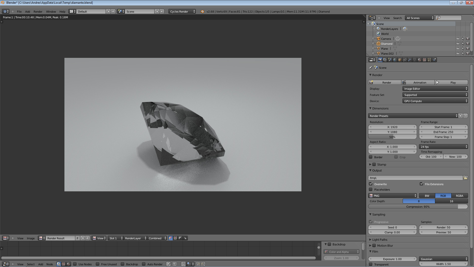 Gracias por responder, solamente hice un diamante di click en material y selecione Glass bsdf y deje todo por defecto, después di click en world y active ambient Occlusion, no he hecho más nada, prácticamente todo está por defecto.