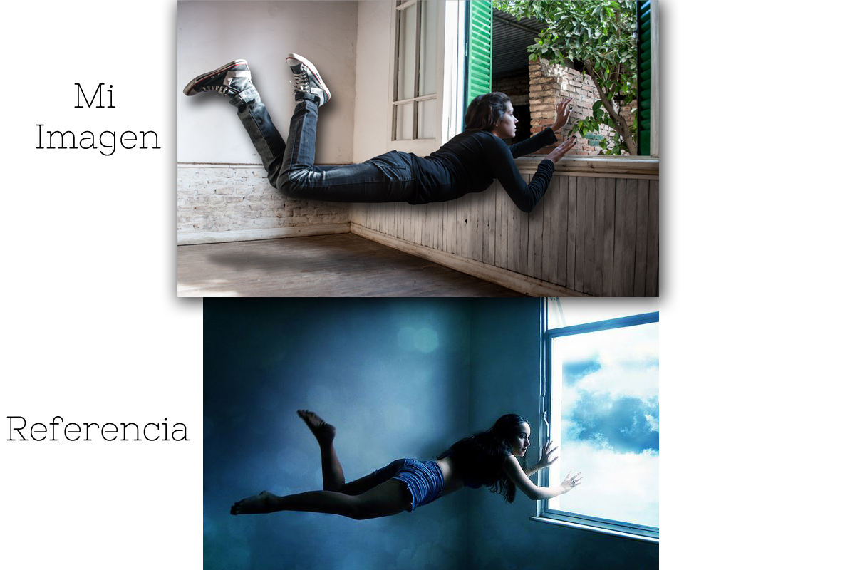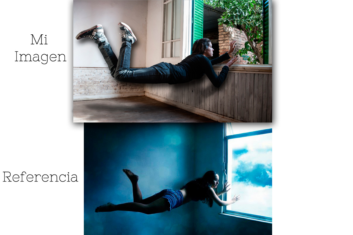 Quita la sombra paralela de alrededor de la chica, lo único que consigue es dar la sensación de que la habitación es un póster pegado a una pared y la chica esta delante, y supongo que, no es lo que quieres conseguir. Si pensamos esa escena en la realidad (pasemos por alto que la chica vuela) tendría sombras muy distintas: la luz entra por la ventana (desde arriba) y proyecta la sombra de la chica sobre el suelo y la pared delantera (la de la ventana). Algo como lo que ves en la imagen que adjunto, pero como digo quitando esa sombra de alrededor que tiene la chica en tú imagen (el apaño está hecho de forma rápida y chapucera, pero creo que se entiende lo que quiero decir).