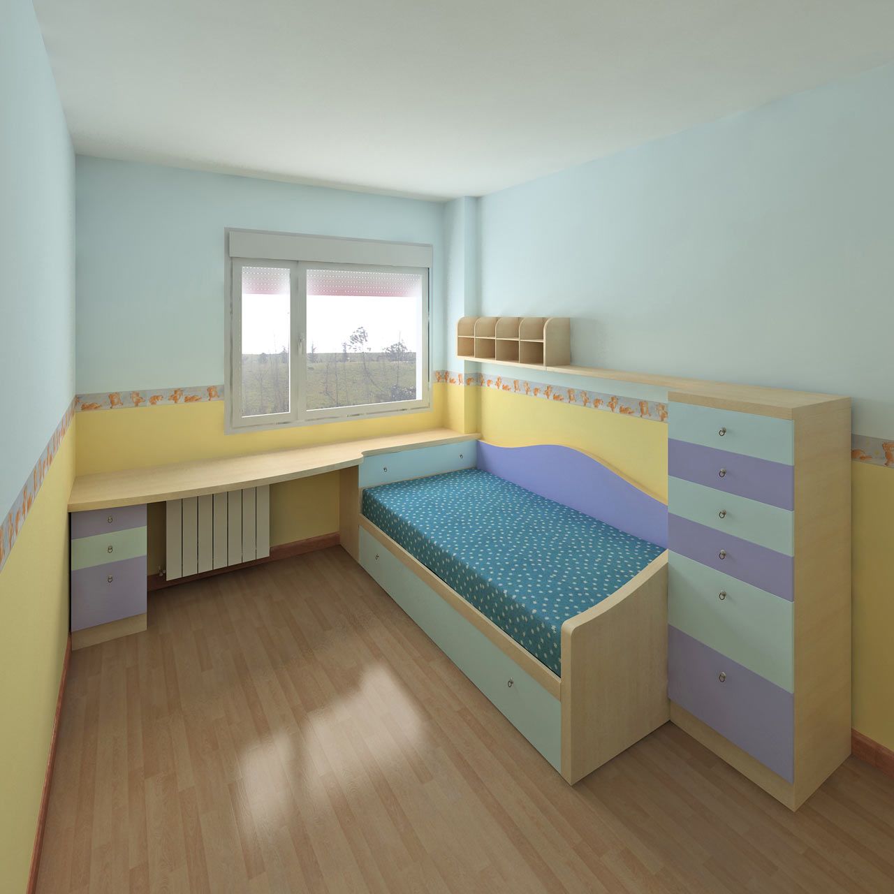 Hola a todos os dejo una imagen de la habitación que estoy preparando para mí hija, todavía queda por meter bastantes cosas como una lámpara, libros, estore, un colchón mejor preparado y retocar algunos parámetros de Vray, ya que veo que salen por ahí algunos artefactos, así como el material del suelo ya que en realidad no refleja tanto.