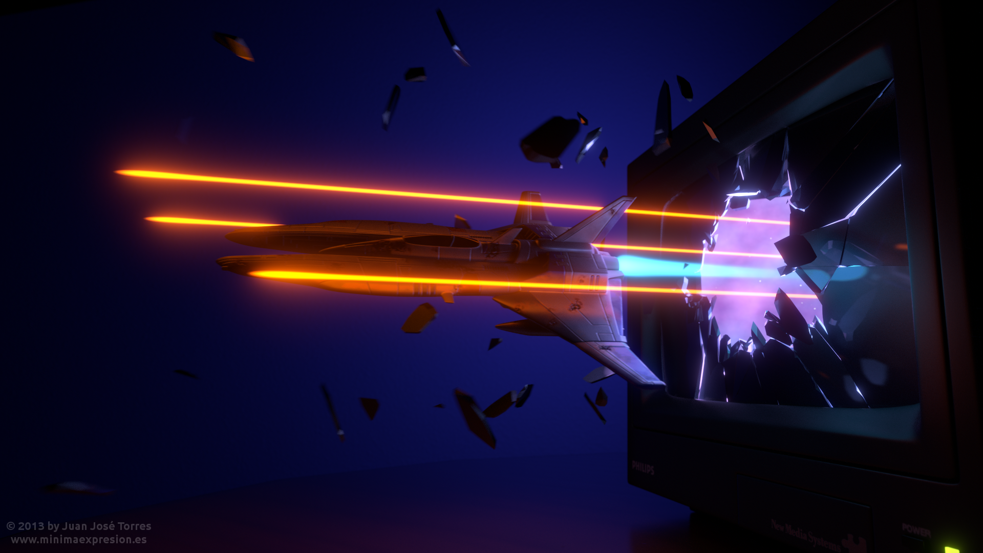 Alguien en Blenderartists me sugirió hablando de mi anterior proyecto que añadiera alguna pantalla de Gradius (también conocido como Nemesis en España) en el monitor. La idea me gustó, así que, decidí llevar el concepto más allá y aquí está el resultado: el Vic Viper de la saga Gradius literalmente rompiendo la cuarta pared en un MSX Philips.