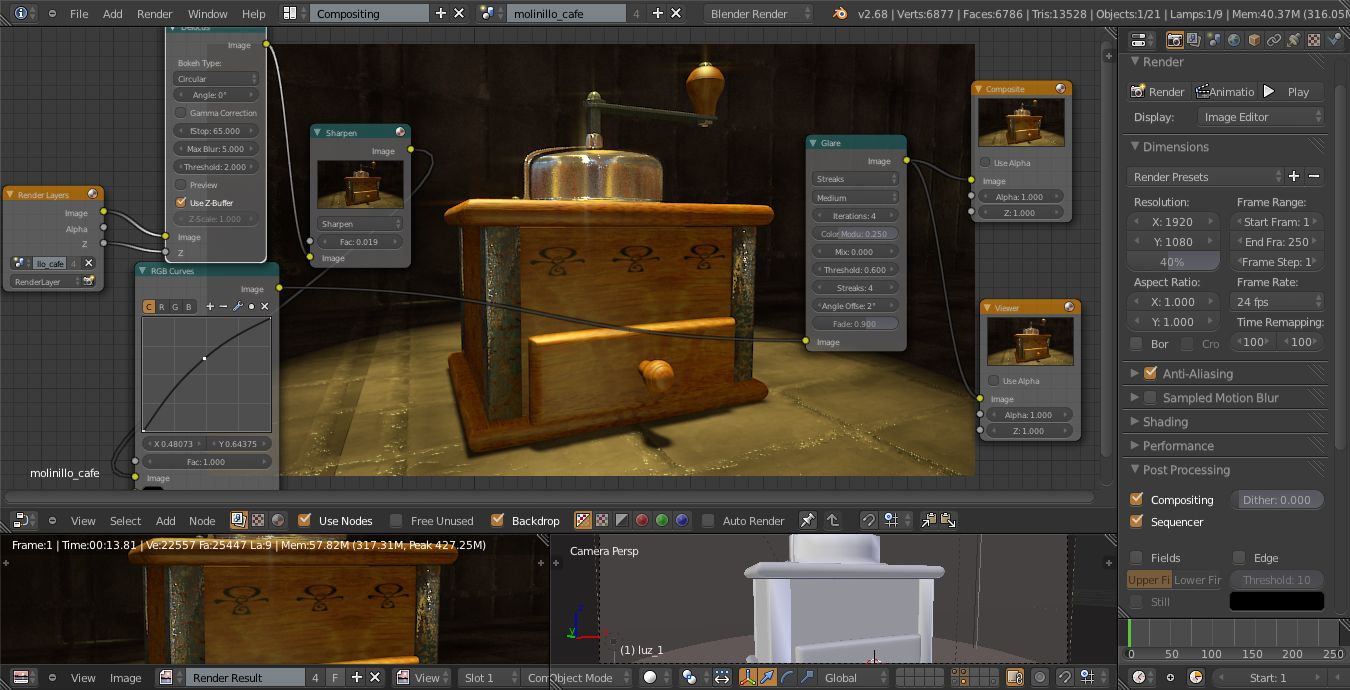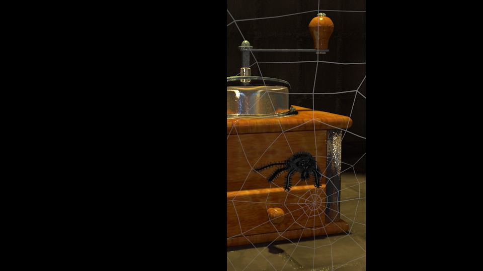 He hecho lo que me has dicho (lo que he podido). He llevado la cámara más atrás tocando el focal length, porque no me dejaba meter mejor el dof. Ahora si está más suave los bordes del foco. El color general ahora es más blanquecino. Y así es cómo queda de momento.