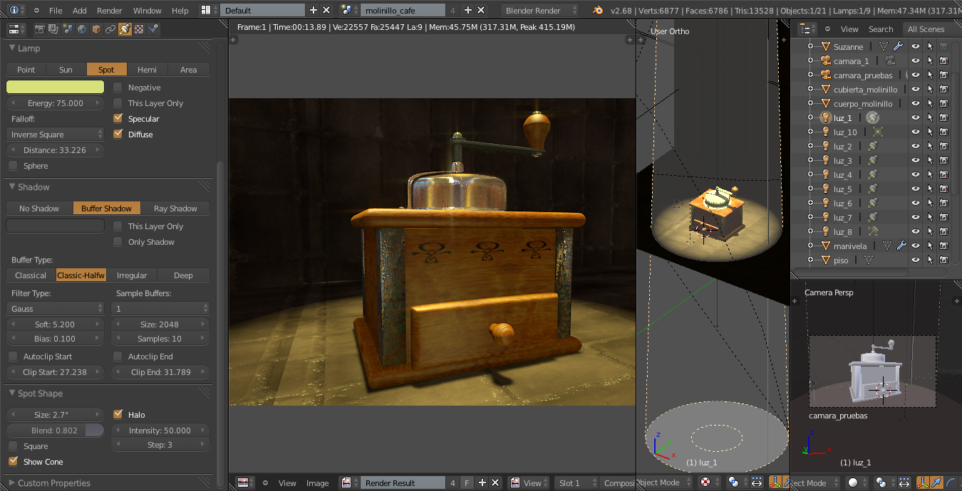 Estos son los parámetros que he usado en el foco principal y en la luz ambiental. Las demás luces son rebotes a baja intensidad y alguna para aumentar un poco el brillo (delante). El halo parece que no se nota y no consigo suavizar más los bordes de la lámpara principal.