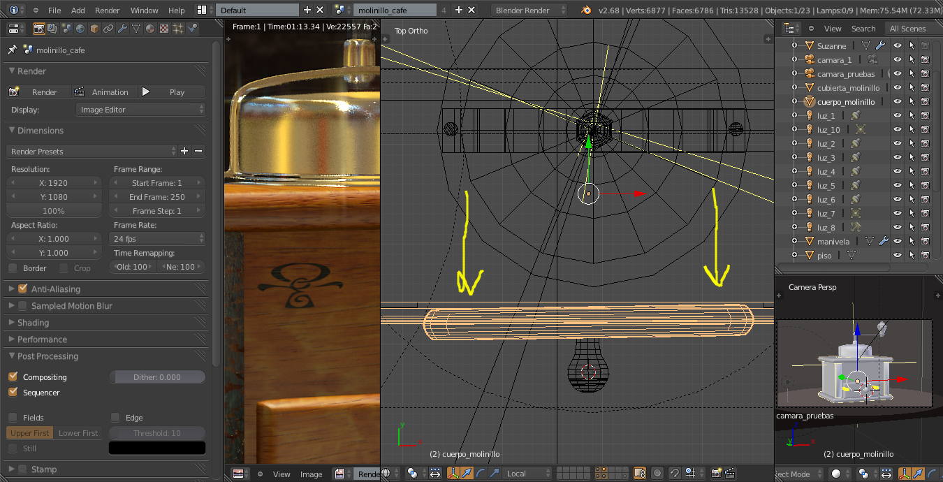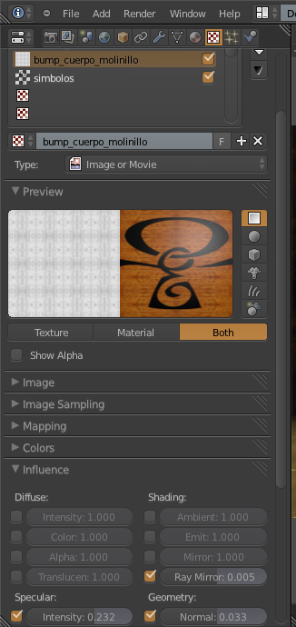 Ya he conseguido que salgan los simbolitos, aunque no puedo hacer el relieve con ellos. Ahora me da otro problema; se me llena el modelo con franjas negras, como si se intentara poner los símbolos en todo el cuerpo del molinillo.