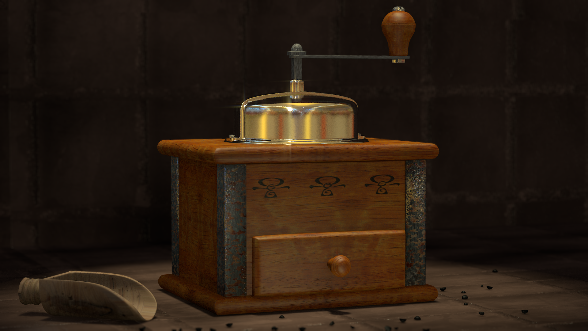Aun veo extraño el material de madera. Ponle algo de desplazamiento o un mapa de normales. Se ve muy plástico y perfecto. La iluminación la llevas por buen camino. Saludos.