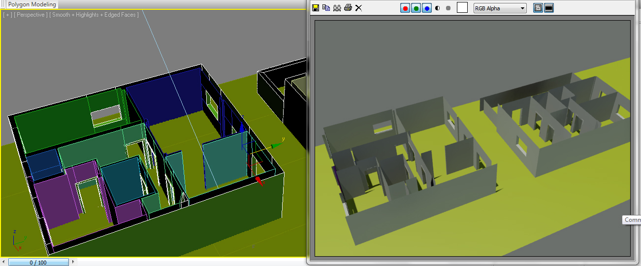 Estaba construyéndolos cuando al darle a un render para comprobar cómo se visualizaba, he comprobado que algunas de las paredes no se ven y encima están todas en negro cuando cada una tiene unos colores asignados. No sé si es por algo que haya podido hacer o por el programa qué da problemas, pero.