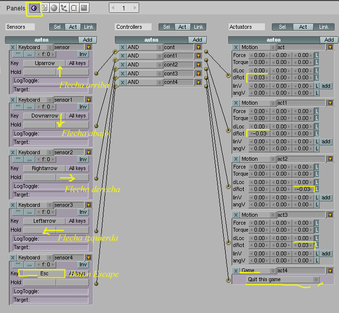 Son sensores de tipo keyboard (teclado) con los valores de las flechas y de la tecla escape. A las flechas se les a dado un valor de rotación dRot en sus diferentes ejes y la tecla escape un valor de Game, para abandonar el juego.
