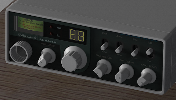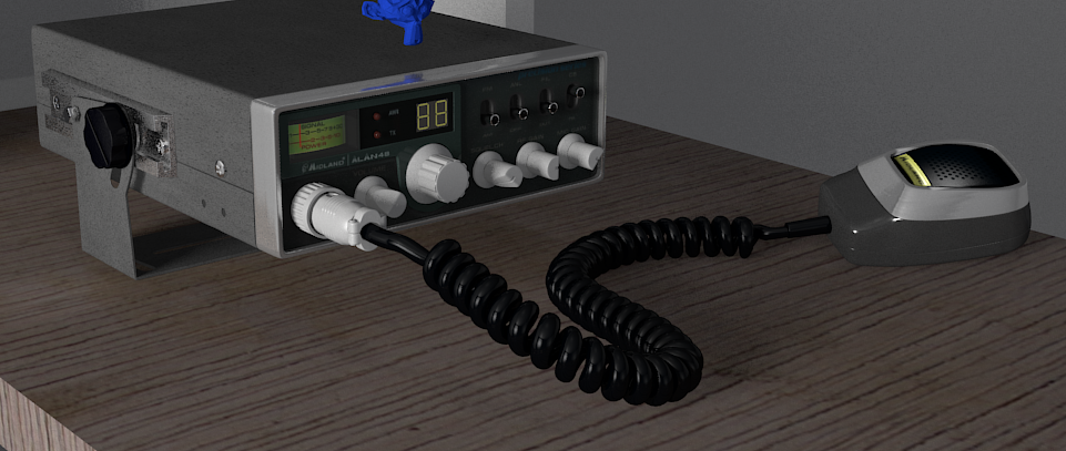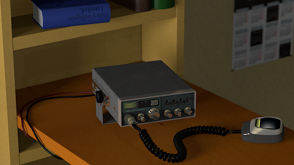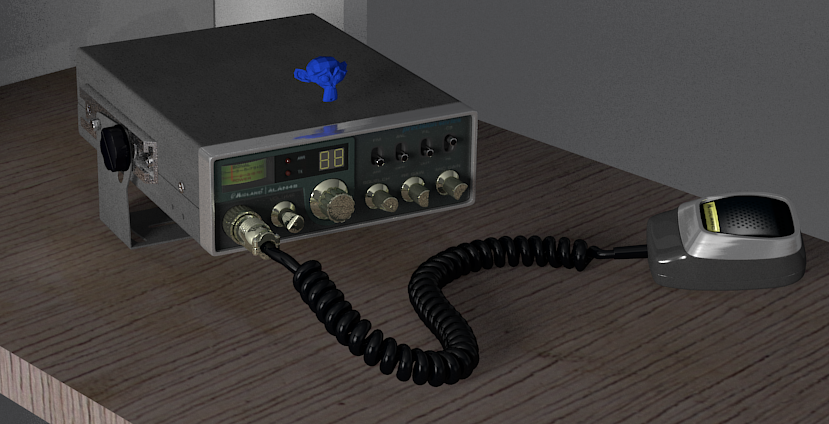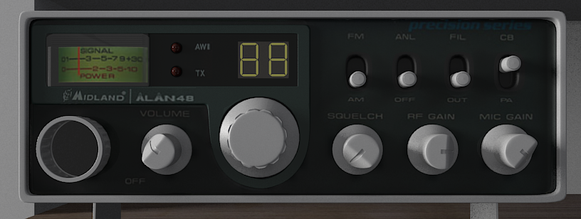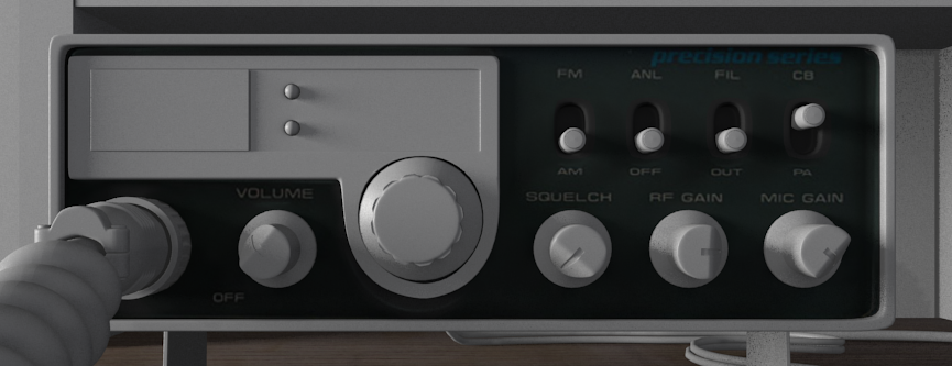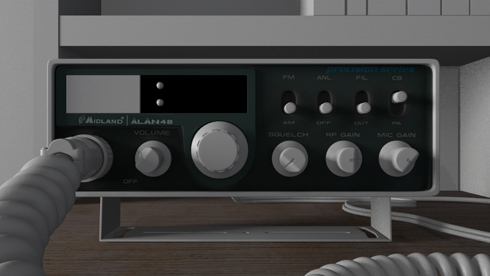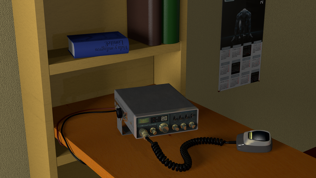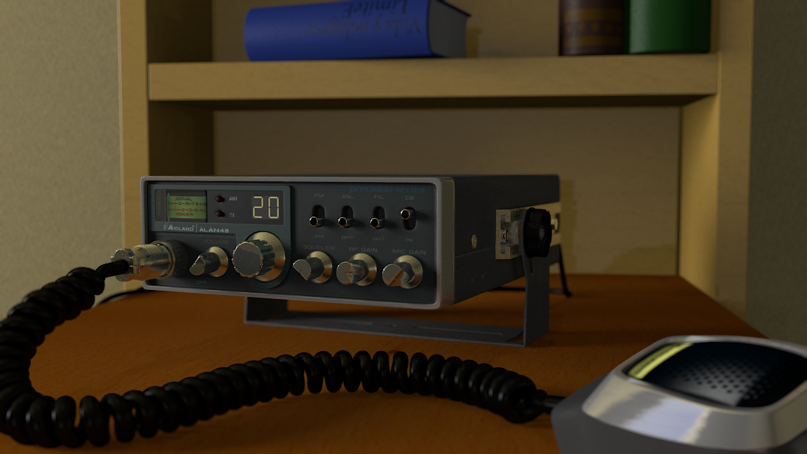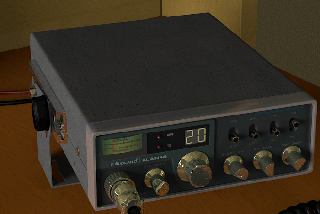 Bueno hasta aquí modelado, iluminación y superficies de este proyecto que ha sido la emisora Midland Alan 48 (todo un clásico); salvo cambios según me digáis que tuviera qué hacer. Los cables de alimentación y antena se los iré colocando, darle cuerpo a la habitación (paredes, mesa, estantes y modelar algunos libros), y quizás algún cambio en la iluminación. Pero todo lo que empieza va llegando a su fin. He usado el Gimp para crear un dibujo en blanco y negro, y se lo he aplicado al canal de normal de los potenciometros; quizás me he pasado. A si que cualquier comentario es bien recibido. Saludos.