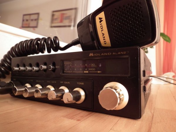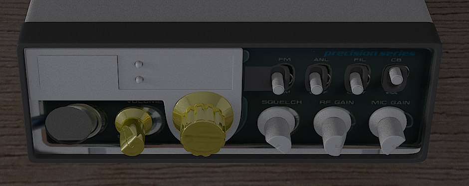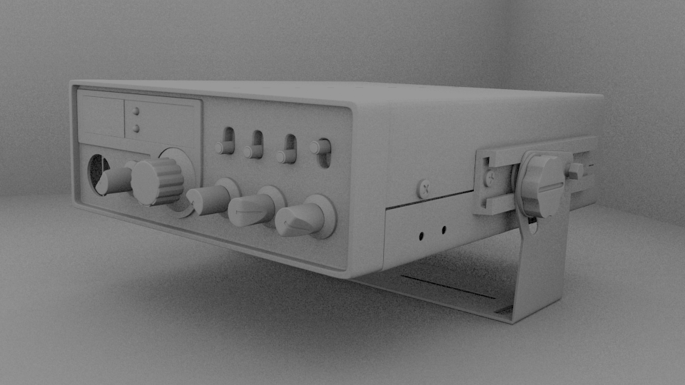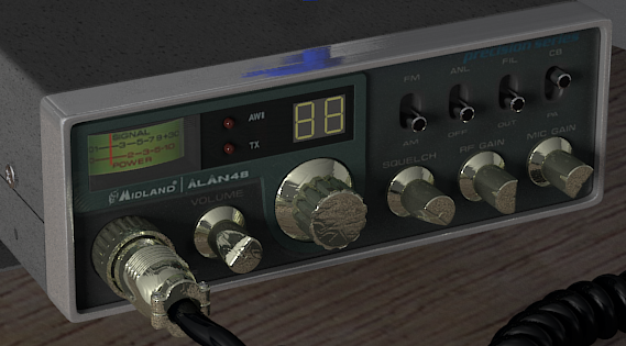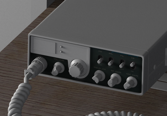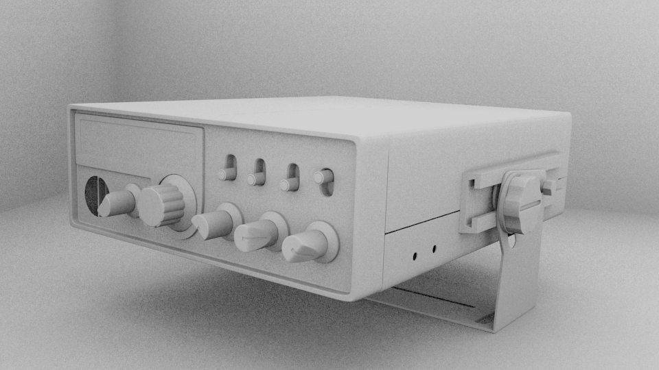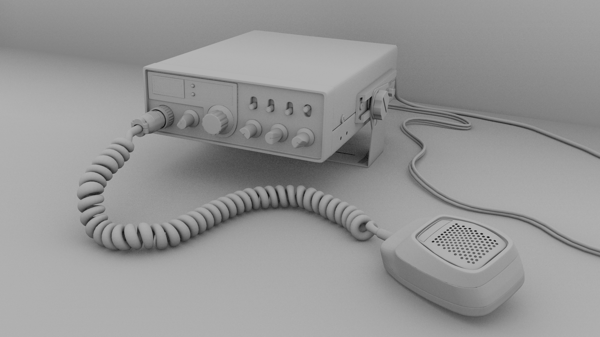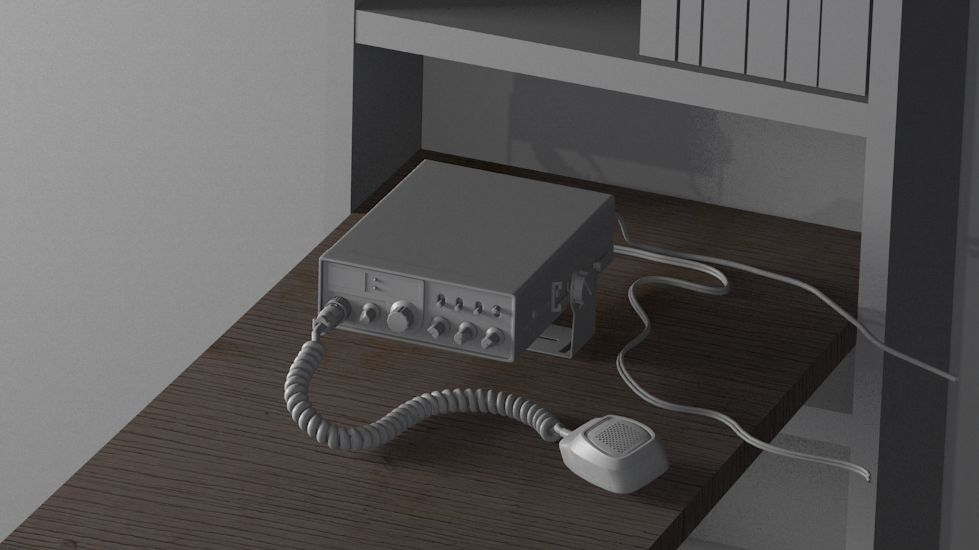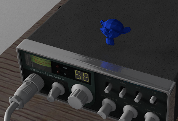 Bueno hasta aquí modelado, iluminación y superficies de este proyecto que ha sido la emisora Midland Alan 48 (todo un clásico); salvo cambios según me digáis que tuviera qué hacer. Los cables de alimentación y antena se los iré colocando, darle cuerpo a la habitación (paredes, mesa, estantes y modelar algunos libros), y quizás algún cambio en la iluminación. Pero todo lo que empieza va llegando a su fin. He usado el Gimp para crear un dibujo en blanco y negro, y se lo he aplicado al canal de normal de los potenciometros; quizás me he pasado. A si que cualquier comentario es bien recibido. Saludos.
